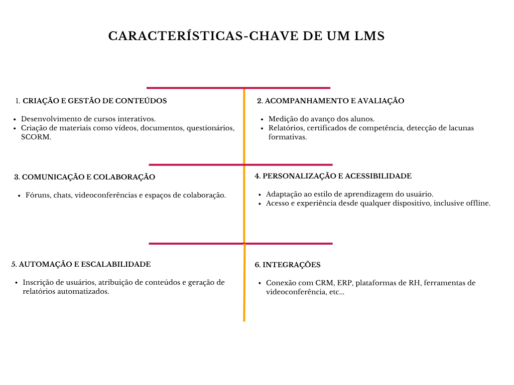 De acordo com a análise da Palentino, um LMS deve oferecer um conjunto robusto de funcionalidades, entre as quais se destacam: