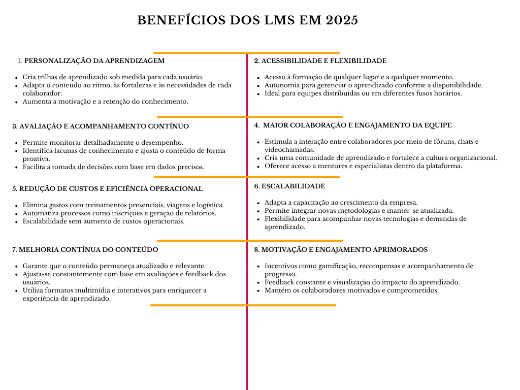Ao oferecer aprendizagem personalizada, flexibilidade, acesso contínuo e ferramentas avançadas de análise, os LMS permitem que as organizações não apenas formem seus funcionários, mas os preparem para os desafios do futuro.