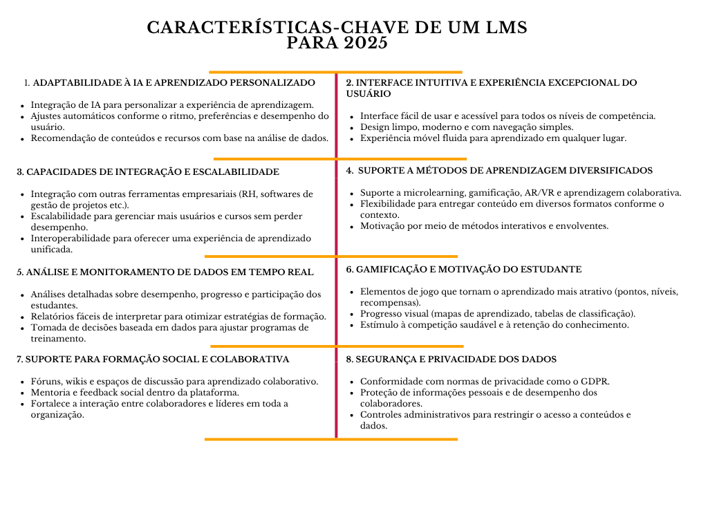 Os LMS tradicionais costumavam ser simplesmente repositórios de cursos online. Em contrapartida, os LMS de 2025 são plataformas integradas e inteligentes, que oferecem aprendizagem personalizada, automação com inteligência artificial, gamificação e análise avançada. Estes sistemas também permitem aprendizagem autônoma e adaptativa, o que facilita a capacitação contínua e escalável.