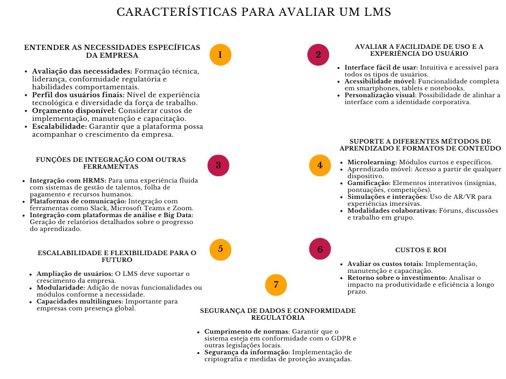 Ao escolher um LMS, você deve avaliar as necessidades específicas de sua organização, como o tamanho de sua equipe, os tipos de aprendizagem que deseja implementar, a flexibilidade que precisa, e a facilidade de integração com outros sistemas. Além disso, verifique que a plataforma tenha características como personalização, acessibilidade móvel, ferramentas de análise e suporte técnico adequado.