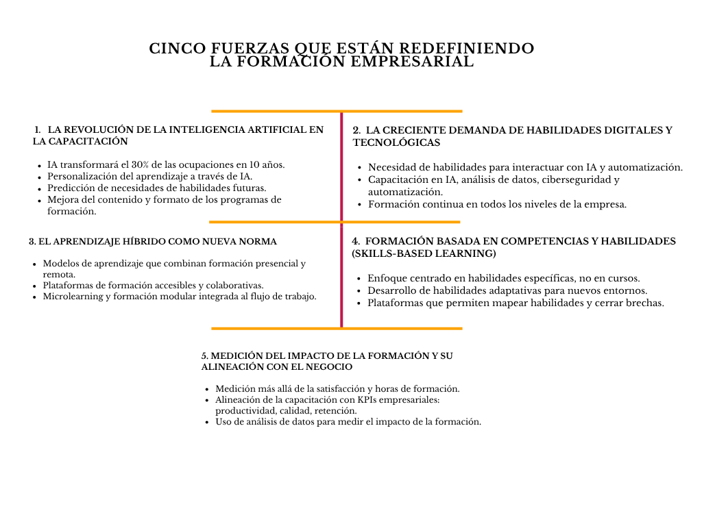 Según PwC, cinco fuerzas están redefiniendo la capacitación corporativa: inteligencia artificial, habilidades digitales, modelos híbridos de trabajo, formación basada en competencias y medición estratégica del impacto. Estas no son tendencias pasajeras, sino señales de una transformación estructural.