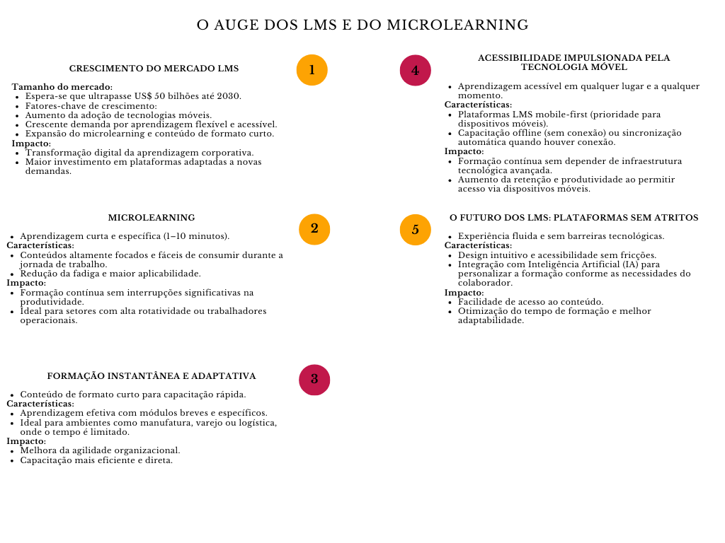 As projeções indicam que o mercado superará os 50 bilhões de dólares até 2026, impulsionado por tecnologias emergentes, maior demanda de microlearning e a necessidade de experiências móveis, inteligentes e personalizadas.
