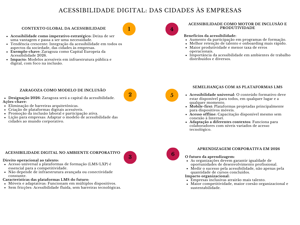 A acessibilidade deixou de ser um valor agregado para se converter em um imperativo estratégico. Assim como cidades inteiras estão reimaginando seus espaços para garantir a inclusão universal, as empresas enfrentam o desafio de democratizar o conhecimento e assegurar que cada funcionário, independentemente de seu ambiente ou infraestrutura tecnológica, tenha as mesmas oportunidades de crescimento profissional.