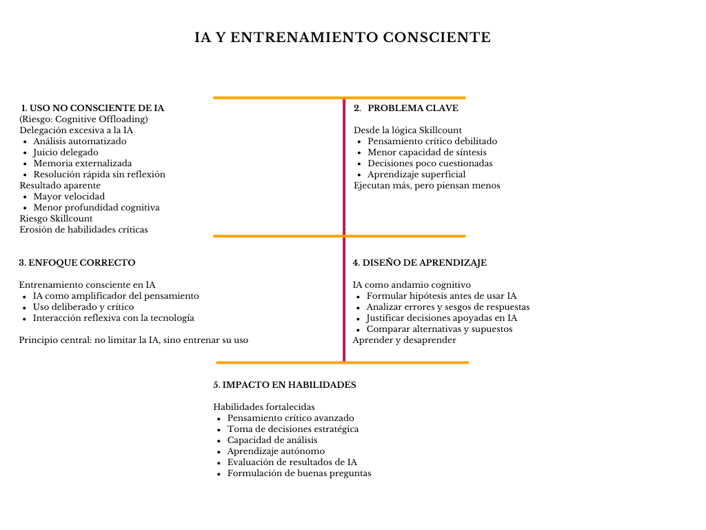 Desde una lógica de headcount, este fenómeno puede pasar desapercibido: el trabajo sigue fluyendo y los indicadores operativos se mantienen. Pero desde una mirada skillcount, el riesgo es evidente. Si la organización no diseña conscientemente cómo se entrena el uso de la IA, puede estar erosionando precisamente las habilidades críticas que busca desarrollar: pensamiento crítico, toma de decisiones, capacidad de síntesis, resolución de problemas complejos y aprendizaje autónomo.
