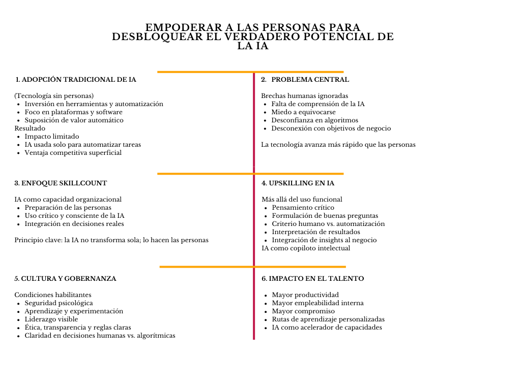 Desde una perspectiva skillcount, la IA no es solo una tecnología a implementar, sino una capacidad organizacional a desarrollar. Su impacto depende directamente de qué tan preparados están los equipos para integrar en sus procesos diarios, cuestionar sus resultados y utilizarla para tomar mejores decisiones. Sin este enfoque, la IA se limita a automatizar tareas existentes, sin generar una verdadera ventaja competitiva.