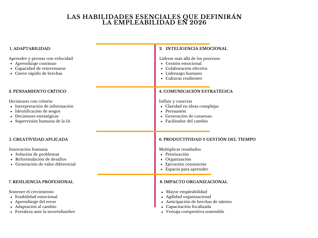 En 2026, la fortaleza de una organización ya no se medirá por cuántas personas tiene, sino por qué habilidades posee su talento y cómo puede movilizarse. Las tendencias laborales más recientes coinciden en que la empleabilidad y el éxito profesional estarán determinados por un conjunto de competencias humanas que ninguna máquina puede reemplazar, incluso en un mundo dominado por inteligencia artificial y automatización. Según KCH Comunicación, estas habilidades se están convirtiendo en el núcleo del valor de cualquier fuerza laboral y serán decisivas tanto para el desarrollo de los individuos como para la agilidad organizacional.