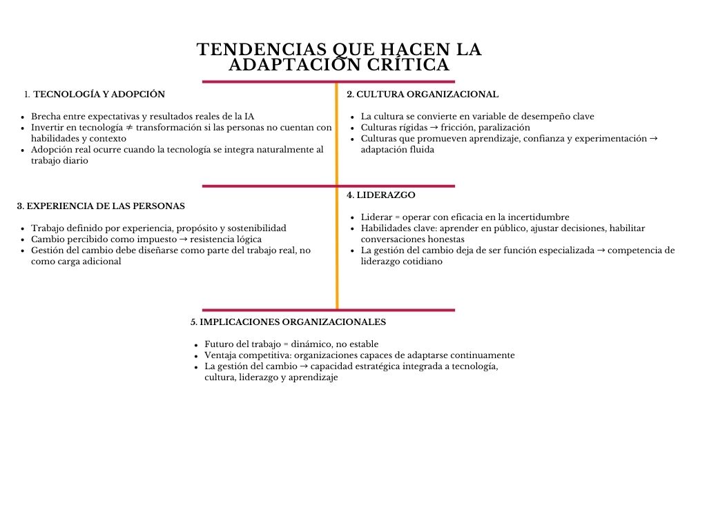 El análisis de estas tendencias muestra un patrón claro: el cambio dejó de ser una disrupción ocasional para convertirse en el contexto permanente en el que ocurre el trabajo. Y en ese contexto, la capacidad de adaptación se consolida como una de las competencias organizacionales más críticas.