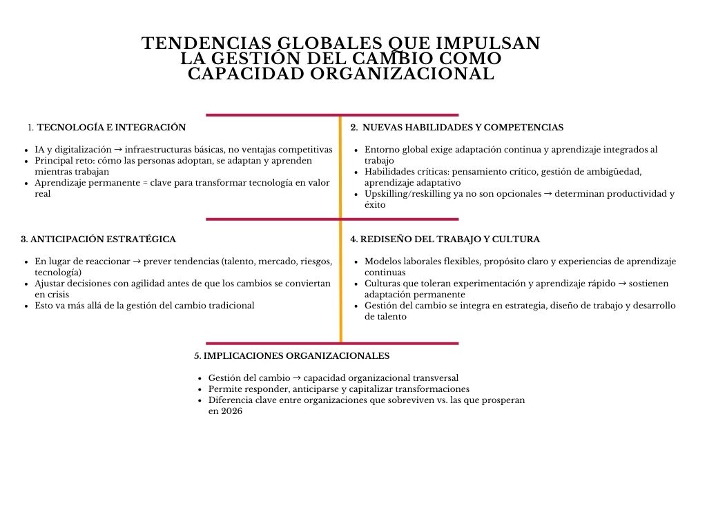En resumen, las tendencias globales de 2026 tecnológicas, culturales y laborales no solo explican por qué las organizaciones necesitan gestionar el cambio de forma diferente, sino también por qué esa gestión debe convertirse en una habilidad organizacional integrada, una capacidad que permita no solo responder, sino anticiparse y capitalizar las transformaciones del entorno.