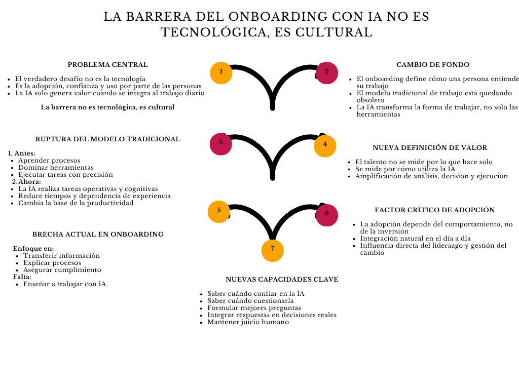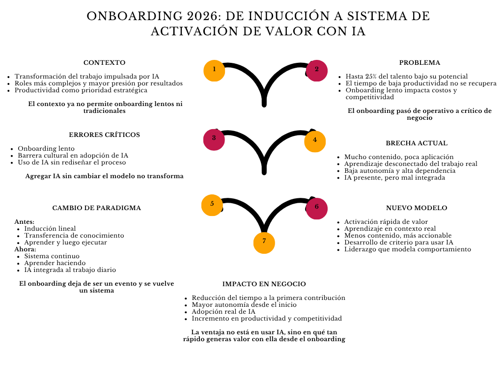 La diferencia entre ambos escenarios no es menor. Es la diferencia entre: organizaciones que usan IA para ser un poco más eficientes y organizaciones que rediseñan su capacidad de ejecución desde la base En un entorno donde la velocidad de aprendizaje y adaptación define la competitividad, esa diferencia es decisiva. Y empieza, inevitablemente, en cómo se diseña el onboarding.