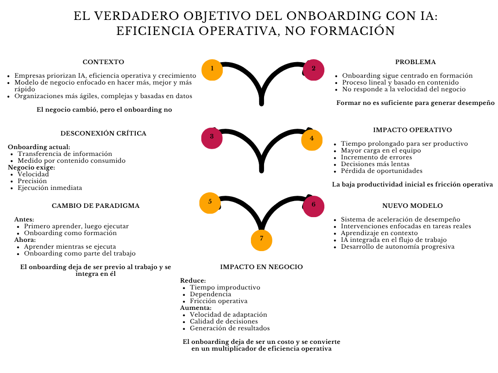 Diagrama el verdadero objetivo del onboarding con IA: eficiencia operativa, no formación